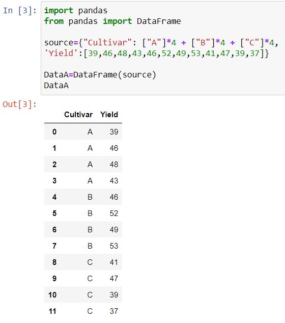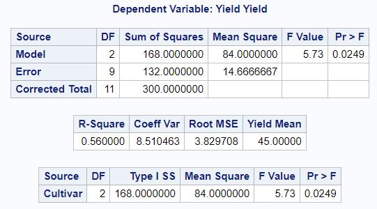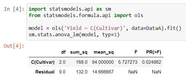model = ols('Yield ~ C(Cultivar)', data=DataA).fit()