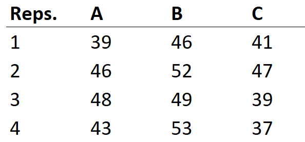 DataA=data.frame(Reps=c(1,2,3,4), A=c(39,46,48,43), B=c(46,52,49,53), C=c(41,47,39,37))