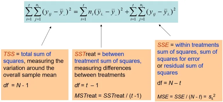 How is TSS calculated? It is the sum of the squared differences between each yield value and the overall mean. In other words, it involves subtracting the overall mean from each of the 12 individual yield data points, squaring the differences, and then adding them up.
