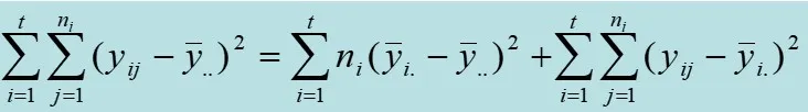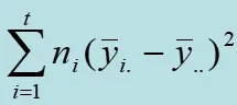 What does this mean? It means that first, we squared the difference between the average yield value (ȳi.) for each variety (since there were four replicates, the average is for those four values) and the overall average yield value (ȳ..) and second, summed them up. In other words, this means that we calculated the sum of squares of the deviations.
