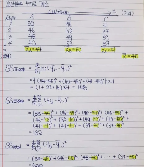 Let’s examine the handwritten calculation. There are three varieties, A, B, and C, and there are four repetitions. The average yield of A is 44, B is 50, and C is 41, and the overall mean is 45.