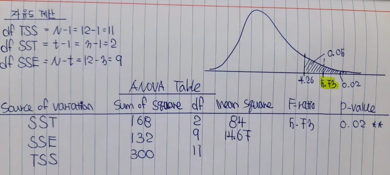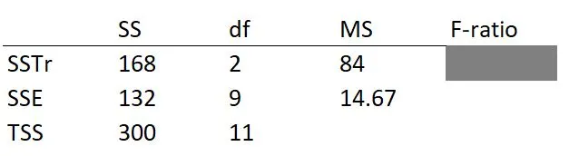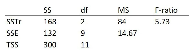 When we divide each Sum of Squares (SS) by its corresponding degree of freedom (df), we get the Mean Square (MS). Let’s call the MS for SST as MST (Mean Squares Treatment) and the MS for SSE as MSE (Mean Squares Error) to distinguish them. So, what is the value of MST? It is 84 (= 168/2). The value of MSE is 14.67 (= 132/9).