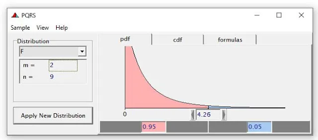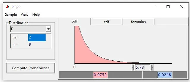 Select F in the Distribution and enter the degrees of freedom for treatments and errors, which are 2 and 9, respectively. What is the critical value of F for α=0.05 in this case? PQRS makes it easy to check.