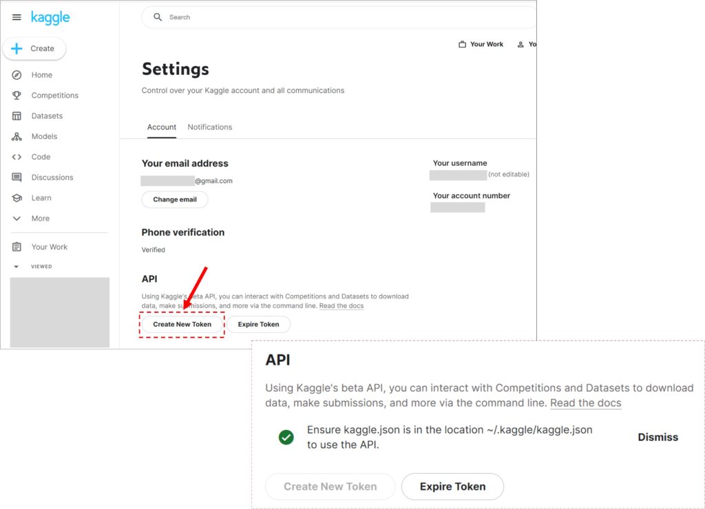 You need to create Kaggle account. After logging in, go to Settings, and click Create New Token. Then, the JSON file, kaggle.json is automatically downloaded.