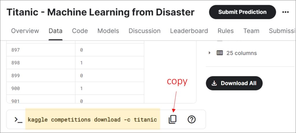 If you go to the Titanic dataset on Kaggle, navigate to the Data tab and scroll down, you will find the Kaggle API about the data.