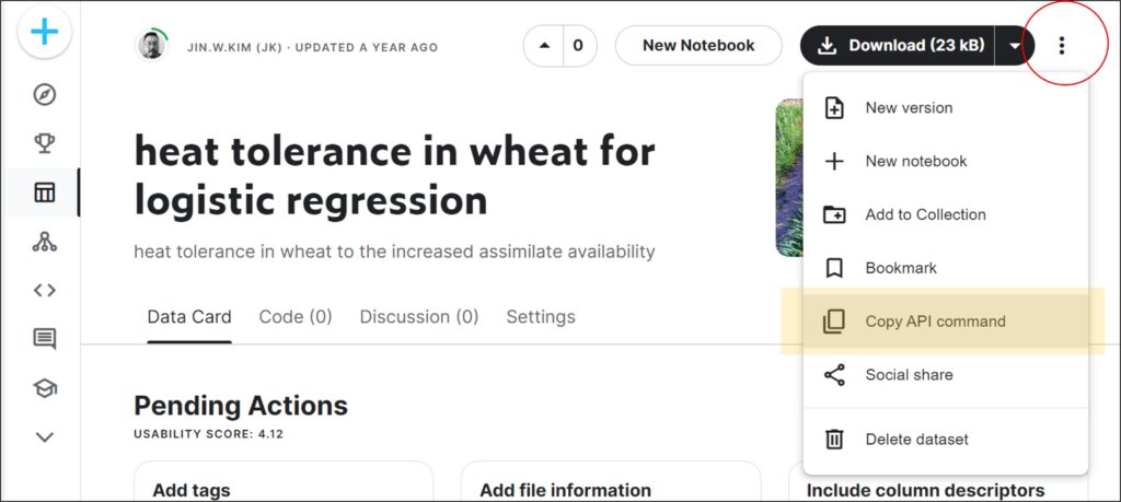 In this case, please click the three dots icon ⋮ located in the upper-right corner, and then click on “Copy API command“. This will copy the API command for this dataset.