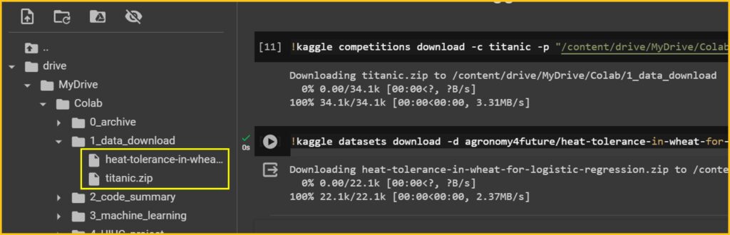 You can write just !kaggle competitions download -c titanic, but I want to download the data to a specific folder (/content/drive/MyDrive/Google Colab/1_data_download) , so I added -p "/content/drive/MyDrive/Google Colab/1_data_download". Remember to put ! in front of the command to use the Kaggle API.