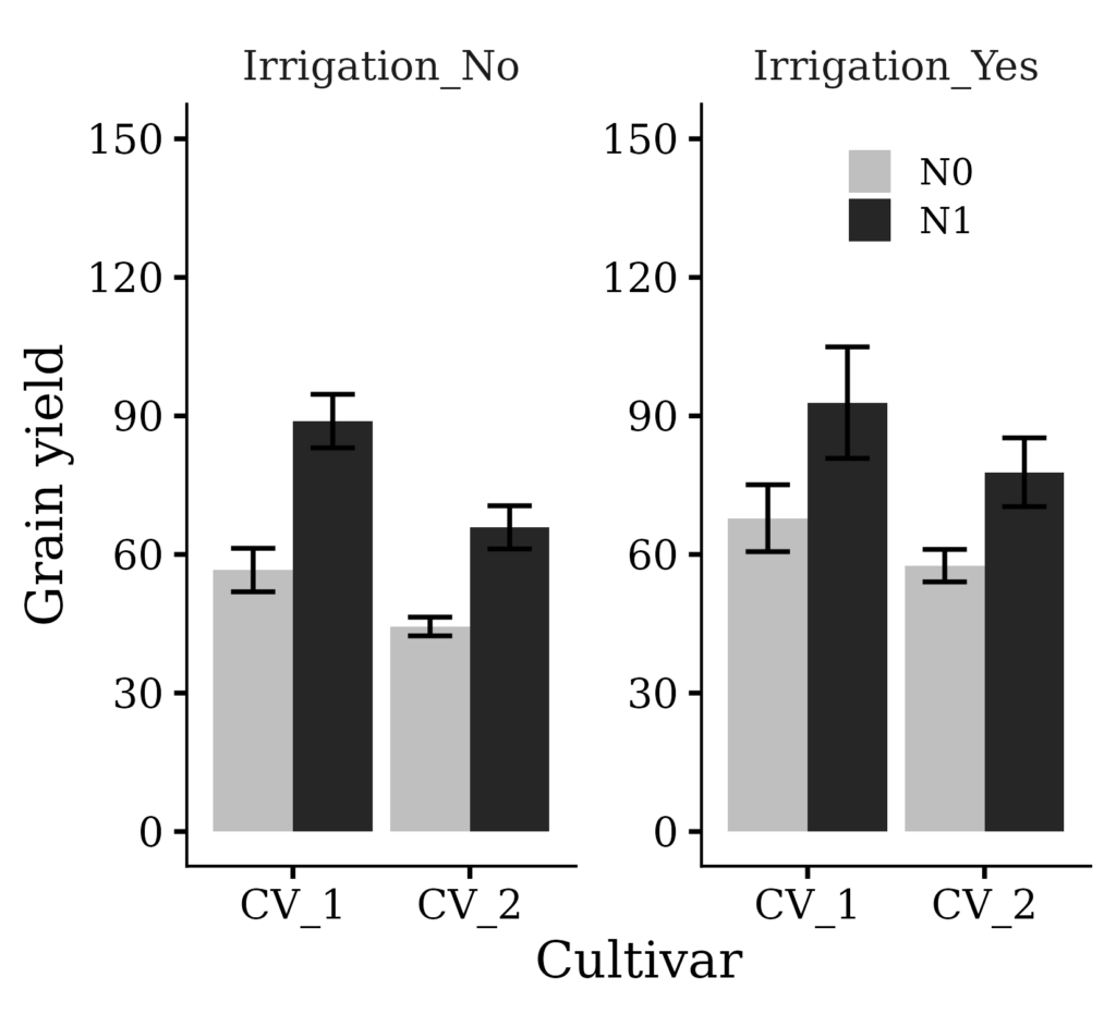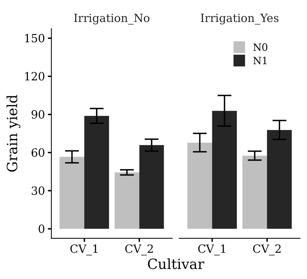 df= tibble::tibble(location= rep(c("A", "B"), each= 16L), cultivar= c("CV_2", "CV_2", "CV_1", "CV_1","CV_2", "CV_2", "CV_1", "CV_1", "CV_2", "CV_2", "CV_1", "CV_1", "CV_2", "CV_2", "CV_1", "CV_1", "CV_1", "CV_2", "CV_1", "CV_2", "CV_2", "CV_1", "CV_1", "CV_2", "CV_2", "CV_2", "CV_1", "CV_1", "CV_2", "CV_2", "CV_1", "CV_1"), irrigation= rep(rep(c("Irrigation_No", "Irrigation_Yes"), 2), each= 8L), fertilizer= rep(rep(c("N1", "N0"), 4), each= 4L), rep= c(2, 3, 1, 4, 2, 3, 1, 4, 1, 2, 3, 4, 1, 2, 3, 4, 1, 2, 3, 4, 1, 2, 3, 4, 1, 4, 3, 2, 2, 4, 3, 1), yield= c(70.5, 73.5, 96.0, 100.9, 49.0, 39.2, 58.8, 68.6, 89.1, 92.1, 117.6, 108.7, 63.6, 63.6, 72.5, 84.2, 75.8, 52.4, 82.8, 67.0614, 44.1, 46.6, 52.5, 45.3, 63.3, 66.7, 78.2, 67.0, 50.3, 52.8, 65.1, 49.6))