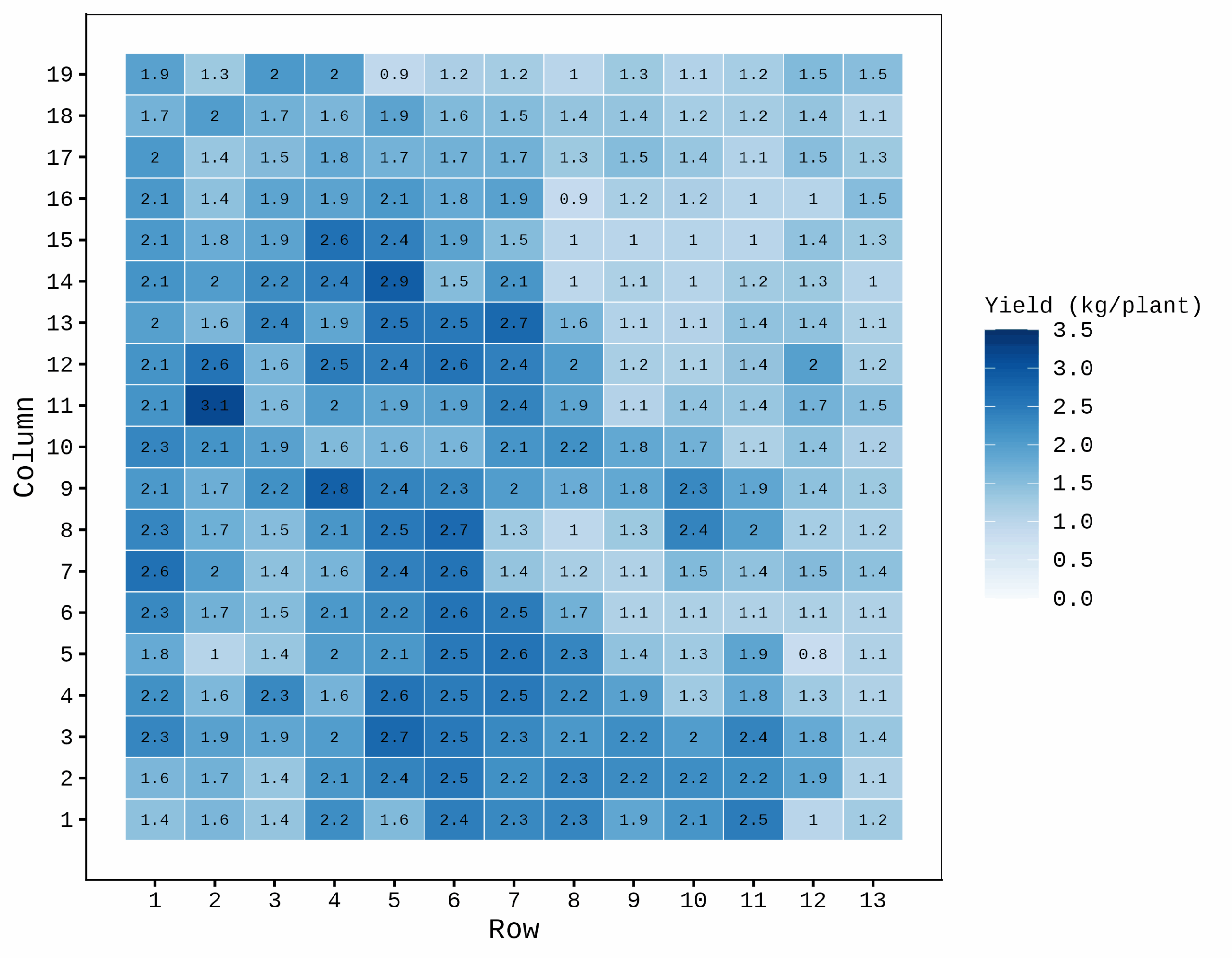 First, let’s create a yield map using geom_tile(). To begin, we’ll upload a dataset.