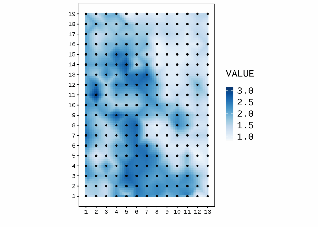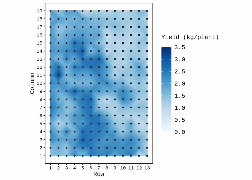 agronomymap() provides functions for generating heatmaps and spatial field visualizations from agronomic trial data, including raster interpolation, point overlays, and customizable axis labeling, and is designed for grid-based field layouts (row/column).