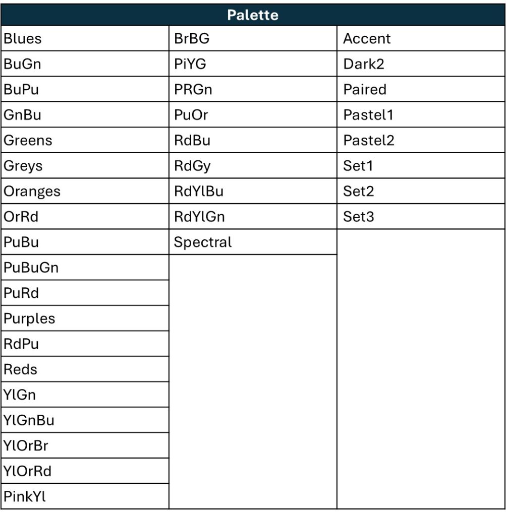 If you want to change the map color, you can simply set palette = "Blues". If you prefer a red color scheme, change it to palette= "YlOrRd".