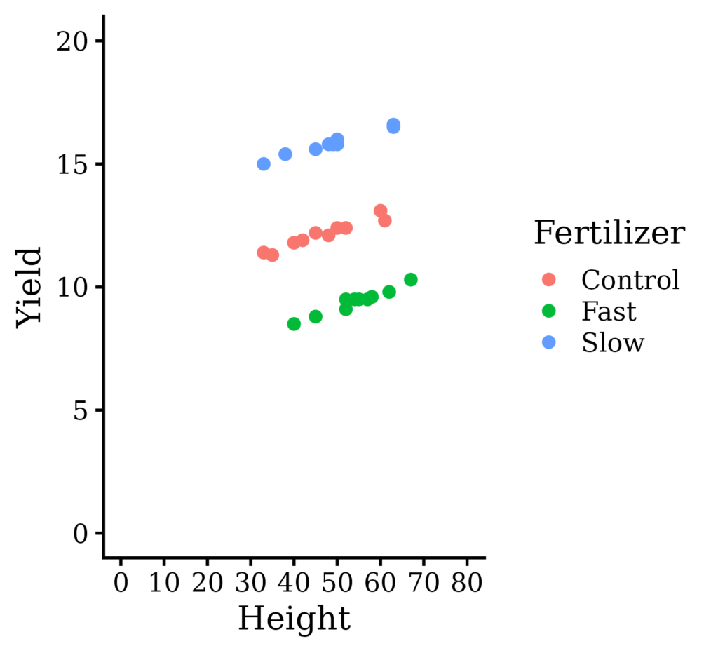 print(dataA) Fertilizer Yield Height 1 Control 12.2 45 2 Control 12.4 52 3 Control 11.9 42 4 Control 11.3 35 5 Control 11.8 40 6 Control 12.1 48 7 Control 13.1 60 8 Control 12.7 61 9 Control 12.4 50 10 Control 11.4 33 11 Slow 16.6 63 12 Slow 15.8 50 13 Slow 16.5 63 14 Slow 15.0 33 15 Slow 15.4 38 16 Slow 15.6 45 17 Slow 15.8 50 18 Slow 15.8 48 19 Slow 16.0 50 20 Slow 15.8 49 21 Fast 9.5 52 22 Fast 9.5 54 23 Fast 9.6 58 24 Fast 8.8 45 25 Fast 9.5 57 26 Fast 9.8 62 27 Fast 9.1 52 28 Fast 10.3 67 29 Fast 9.5 55 30 Fast 8.5 40