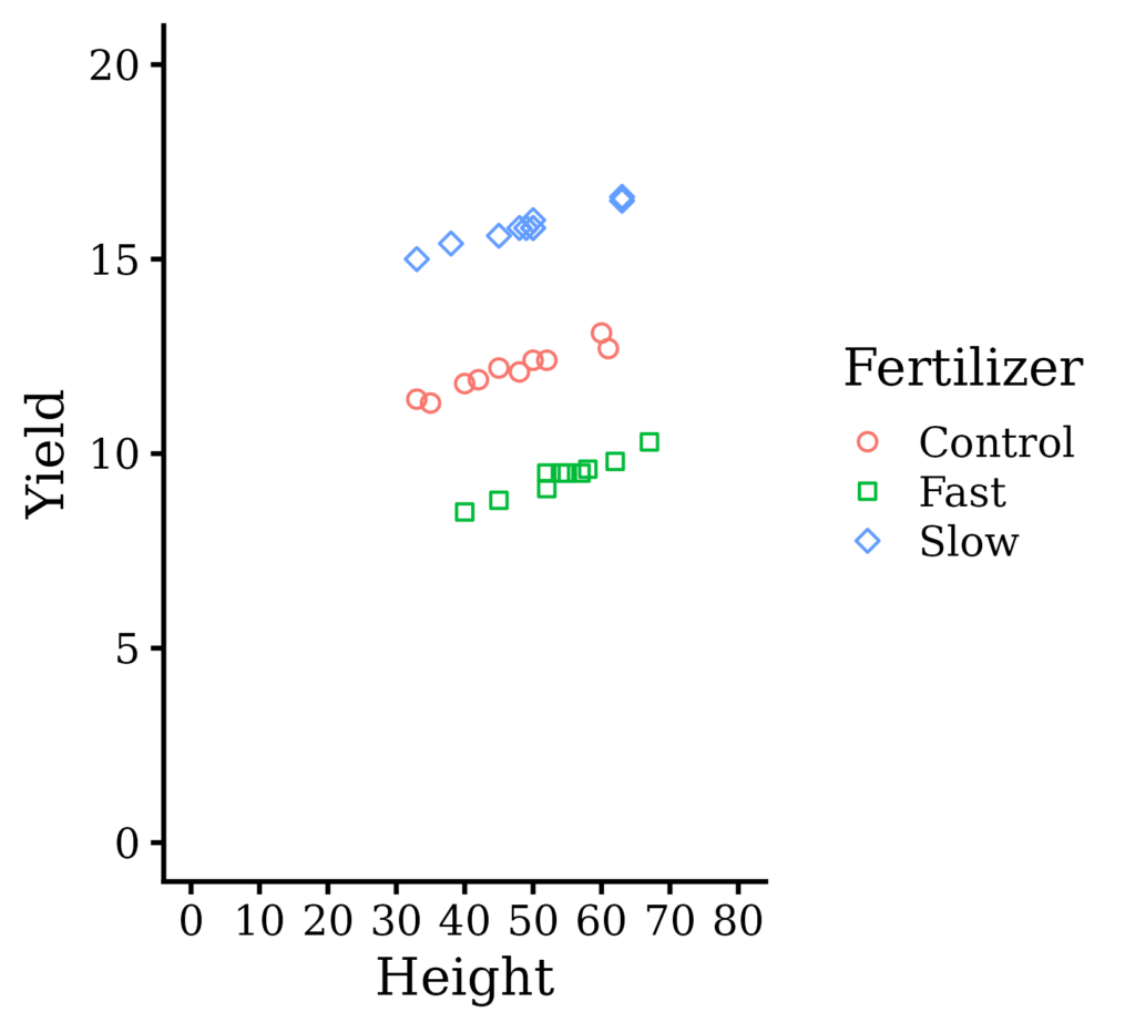 geom_point (aes(color=Fertilizer, shape=Fertilizer)) +