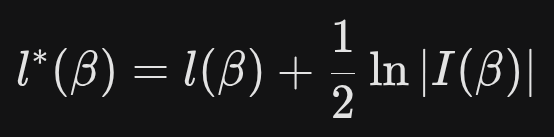 Firth’s Logistic Regression (introduced by David Firth in 1993) uses a penalized likelihood approach. Instead of maximizing the standard likelihood function l(β), it maximizes a modified version: