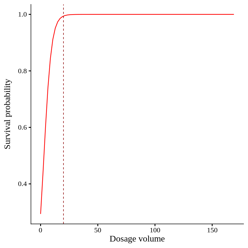 labs(x="Dosage volume", y="Survival probability") +