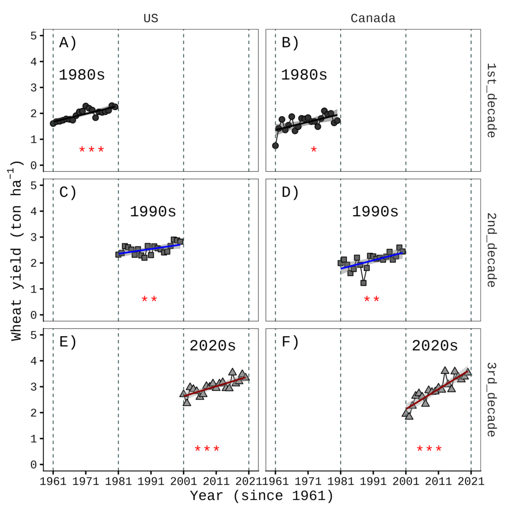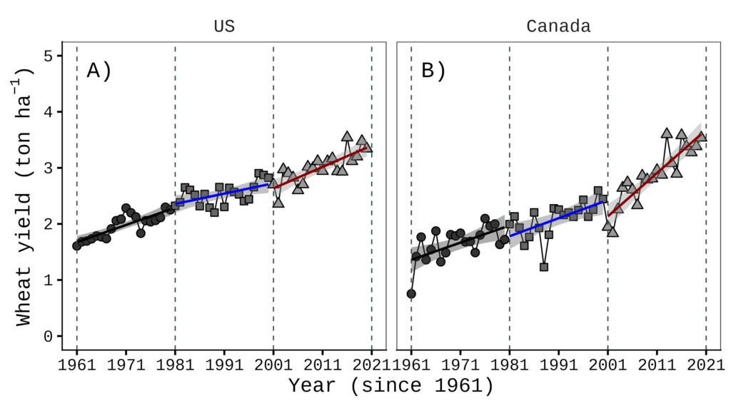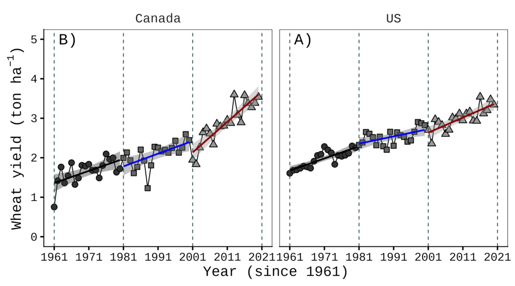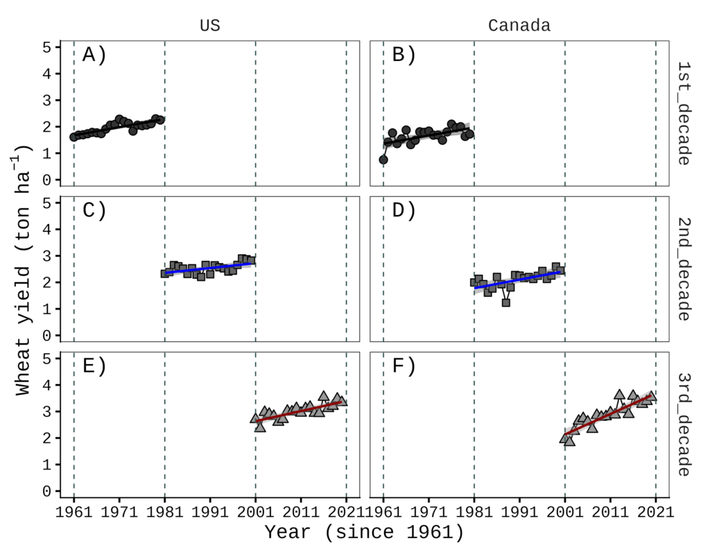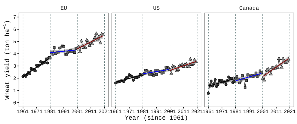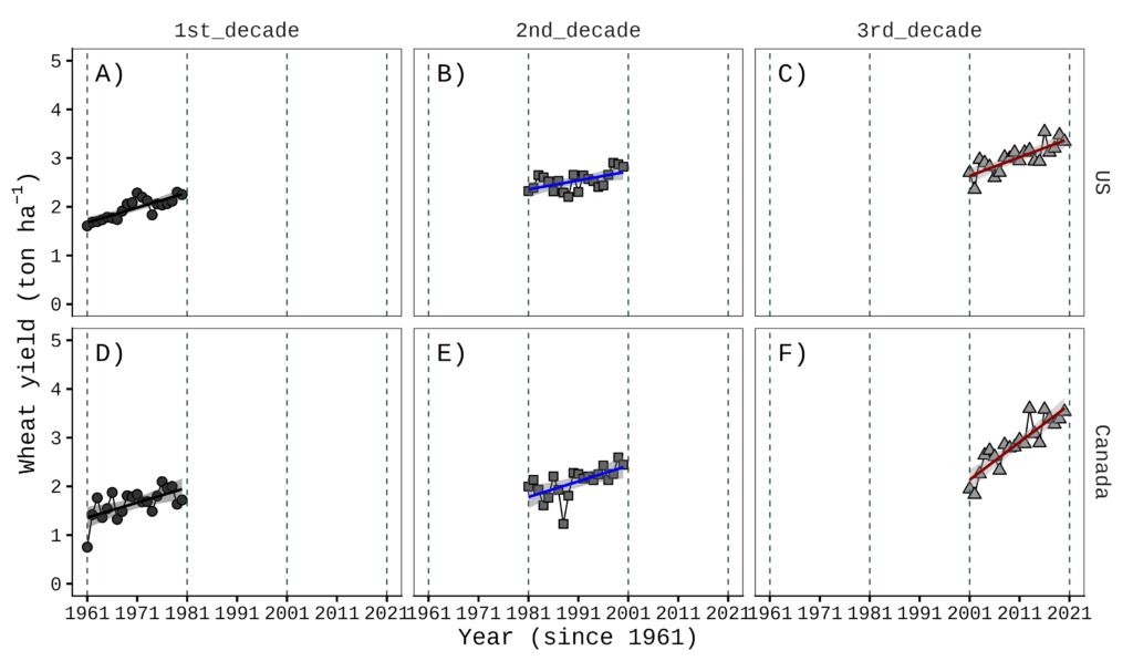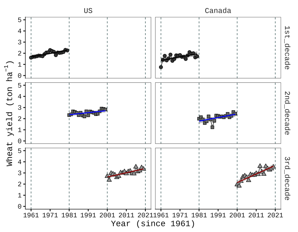 This data is from FAOSTAT. I organized wheat yield data starting from 1961 for the USA, Canada, the EU, and the world. I will present the wheat yield trends over time for the USA and Canada.