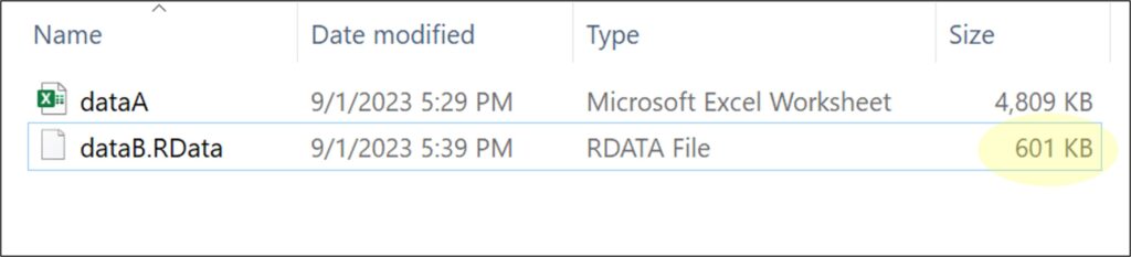 I will now verify if the R file has been successfully saved. The file dataB.RData has been stored on my desktop. However, the file size has decreased to 601 KB. When saving the same data to an Excel file, it becomes approximately 5 MB in size.
