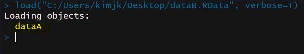The reason for including the verbose=T code is to remind us of the original name of the file that was loaded. When you execute the code, it uploads the R data and explicitly designates the original data name as dataA, indicating that the data is uploaded to R with the original name dataA.